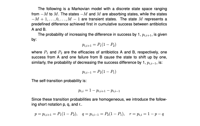 A Markov model can estimate the total test number and the probability that, due to random chance, we select the less effective antibiotic as a superior antibiotc.