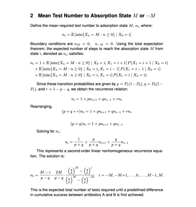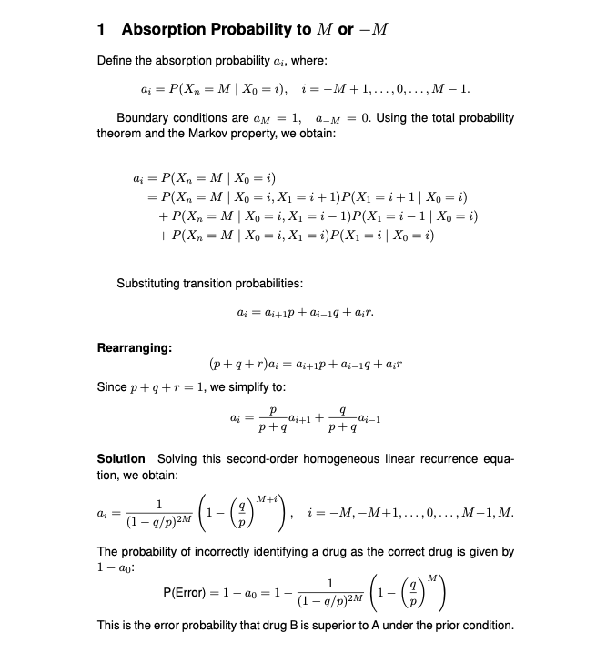 A predefined number, M, of additional successful outcomes for one drug over another serves as the stopping rule. The antibiotics are tested in vitro using repeated assays to assess whether cell growth is inhibited. The test stops once the difference in the total number of successful inhibition tests reaches M, determining the better drug. However, due to various variability, a less effective drug might sometimes appear superior. This option calculates the error probability of reaching a wrong conclusion.