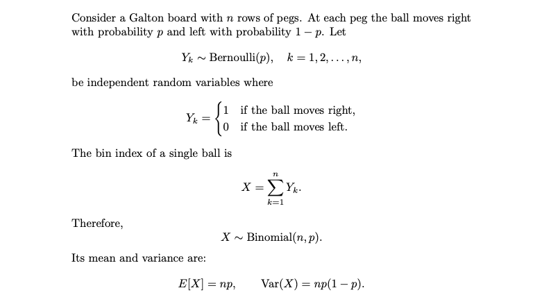 The final horizontal position (bin index) of the ball is therefore the sum of these Bernoulli random variables and follows a binomial distribution. When the number of rows of pegs is moderately large, the binomial distribution is well approximated by a normal distribution, explaining the characteristic bell-shaped curve observed in the device.