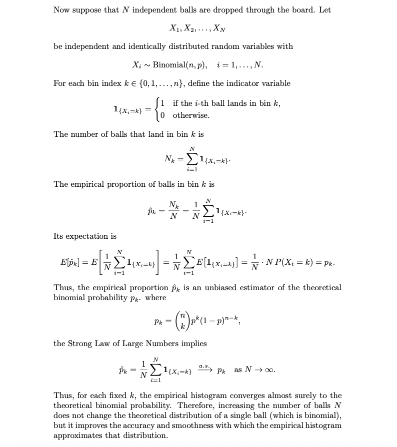 When many balls are dropped independently, the empirical histogram of landing positions converges to the underlying binomial probabilities by the Law of Large Numbers. Thus, the Galton board illustrates several central concepts of probability theory: Bernoulli trials, the binomial distribution, the normal approximation, and convergence of empirical frequencies.